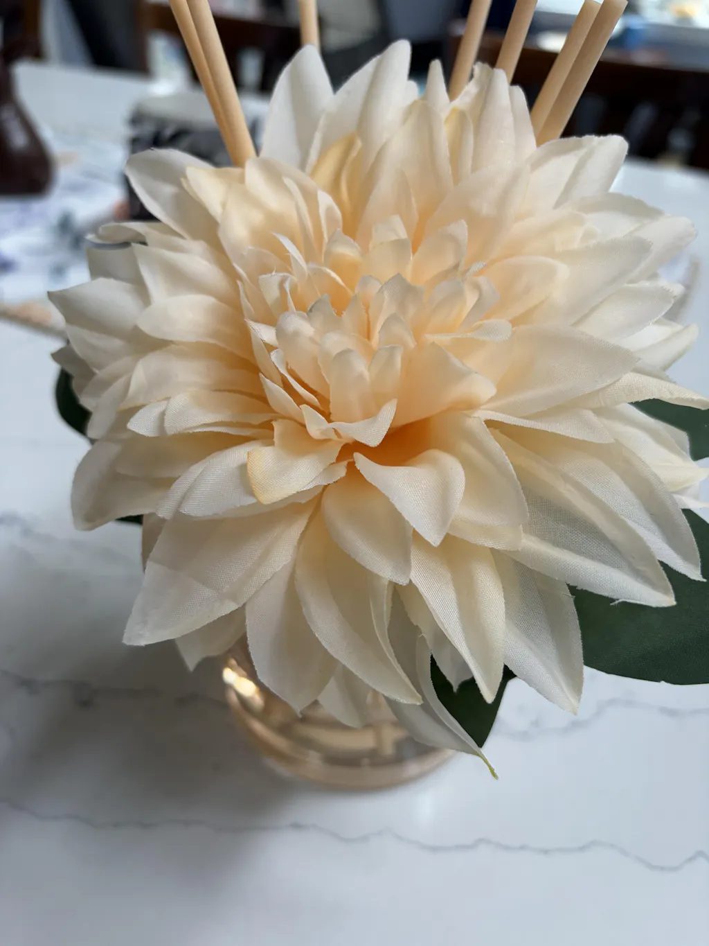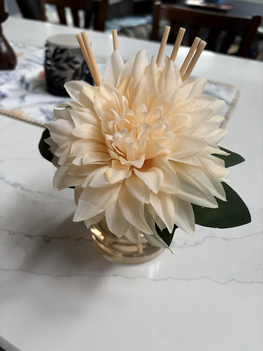 Reed diffuser with yellow flower, green leaves, and elegant floral packaging for home fragrance.